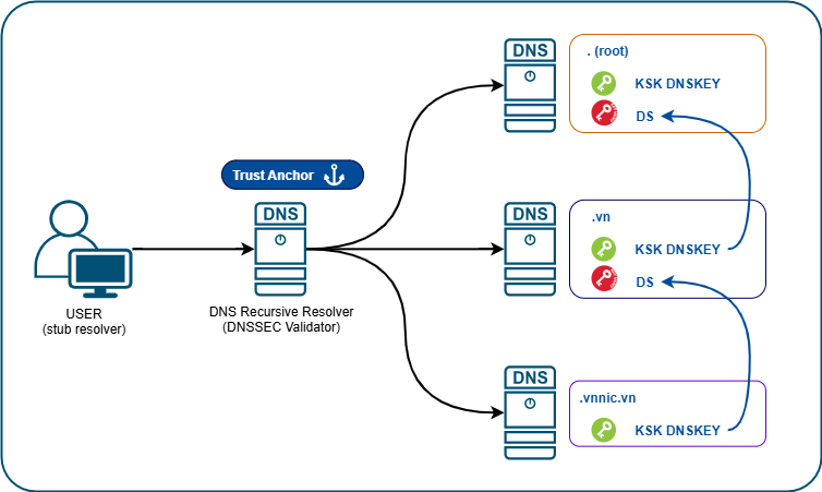 By introducing new DNS record types and enhanced validation procedures, DNSSEC extends DNS with strong security features, ensuring authenticity and integrity of DNS data. It supports traditional DNS operations while strengthening reliability, security, and resilience of the Vietnam National Domain Name Server System.