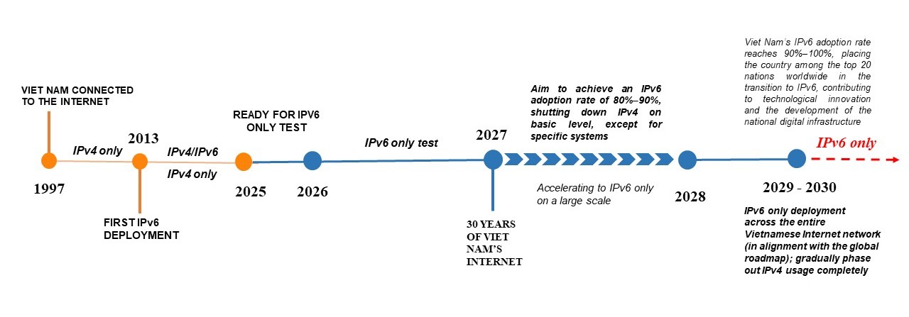 On 27 October 2025, the Ministry of Science and Technology issued the “Program to Promote, Implement, and Transition Viet Nam's Internet to IPv6 only for the 2026 – 2030 period” under Decision No. 3369/QĐ-BKHCN, setting the goal of a comprehensive migration of the Viet Nam's Internet to the next-generation IPv6 only model, in close alignment with Resolution No. 57-NQ/TW and Resolution No. 71/NQ-CP on breakthroughs in the development of science and technology, innovation, and national digital transformation.