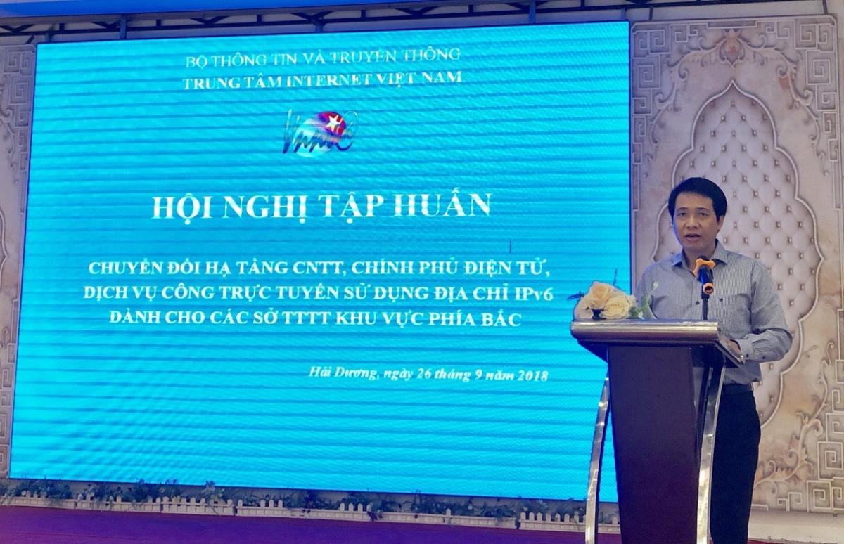 Nhằm tăng cường công tác ứng dụng triển khai IPv6, hỗ trợ các Sở Thông tin và Truyền thông khu vực phía Bắc trong công tác chuyển đổi IPv6 cho hạ tầng CNTT, chính phủ điện tử, dịch vụ công trực tuyến theo Kế hoạch hành động quốc gia về IPv6, ngày 26/09/2018, VNNIC phối hợp với Sở TT&TT tỉnh Hải Dương đã tổ chức “Hội nghị tập huấn về chuyển đổi hạ tầng CNTT, chính phủ điện tử, dịch vụ công trực tuyến sử dụng địa chỉ IPv6 dành cho các Sở TT&TT khu vực phía Bắc”. Tham dự Hội nghị có Lãnh đạo, đại diện các đơn vị của VNNIC và Lãnh đạo, đại diện của 09 Sở TT&TT tại khu vực phía Bắc.