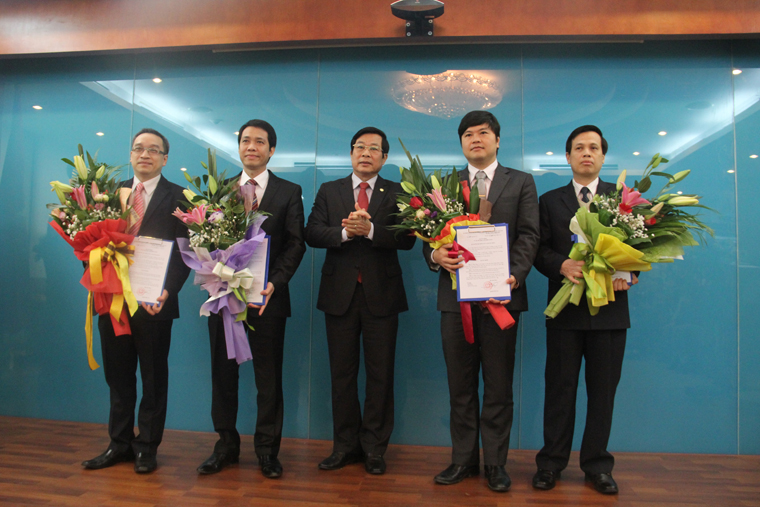 Bộ trưởng Nguyễn Bắc Son (giữa) trao các quyết định cho các đồng chí được bổ nhiệm