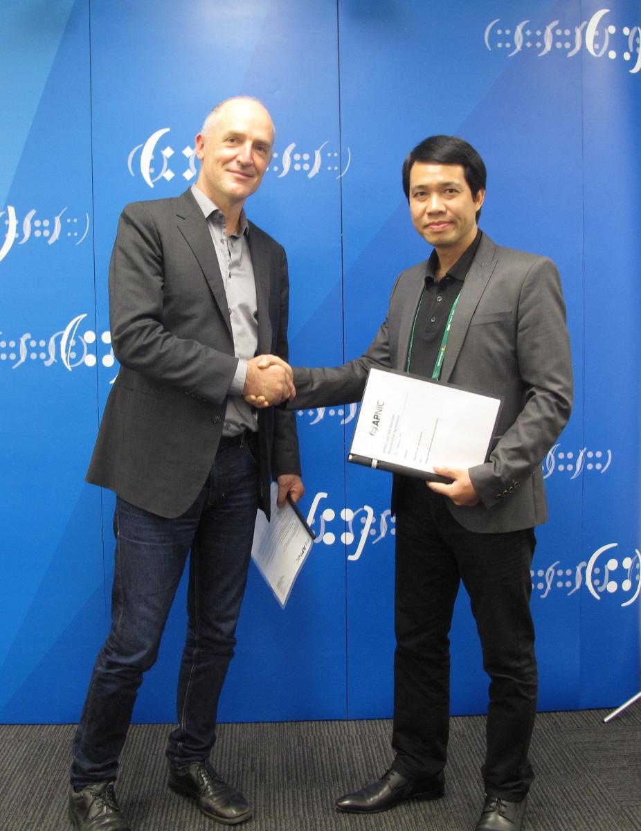 Ông Trần Minh Tân, PGĐ VNNIC và ông Paul Wilson, TGĐ APNIC trao đổi bản thỏa thuận NIR ký giữa VNNIC và APNIC