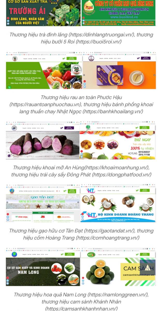 Hỗ trợ cho hàng chục doanh nghiệp với nhiều mặt hàng nông sản địa phương hiện diện trực tuyến qua website giới thiệu sản phẩm kết hợp bán hàng trực tuyến là kết quả ban đầu qua 3 tháng triển khai vừa qua của chương trình phối hợp ba bên (Sở TTTT Vĩnh Long, VNNIC và Nhà đăng ký tên miền iNET). Có thể kể đến một số thương hiệu như bưởi 5 Roi (https://buoi5roi.vn/), trà đinh lăng Trường Ái (https://dinhlangtruongai.vn/), gạo hữu cơ Tân Đạt (https://gaotandat.vn/), cam sành Khánh Nhân (https://camsanhkhanhnhan.vn), rau an toàn Phước Hậu (https://rauantoanphuochau.vn), Bánh phồng khoai lang thuần chay Nhật Ngọc (https://banhkhoailang.vn), và các thương hiệu khác….