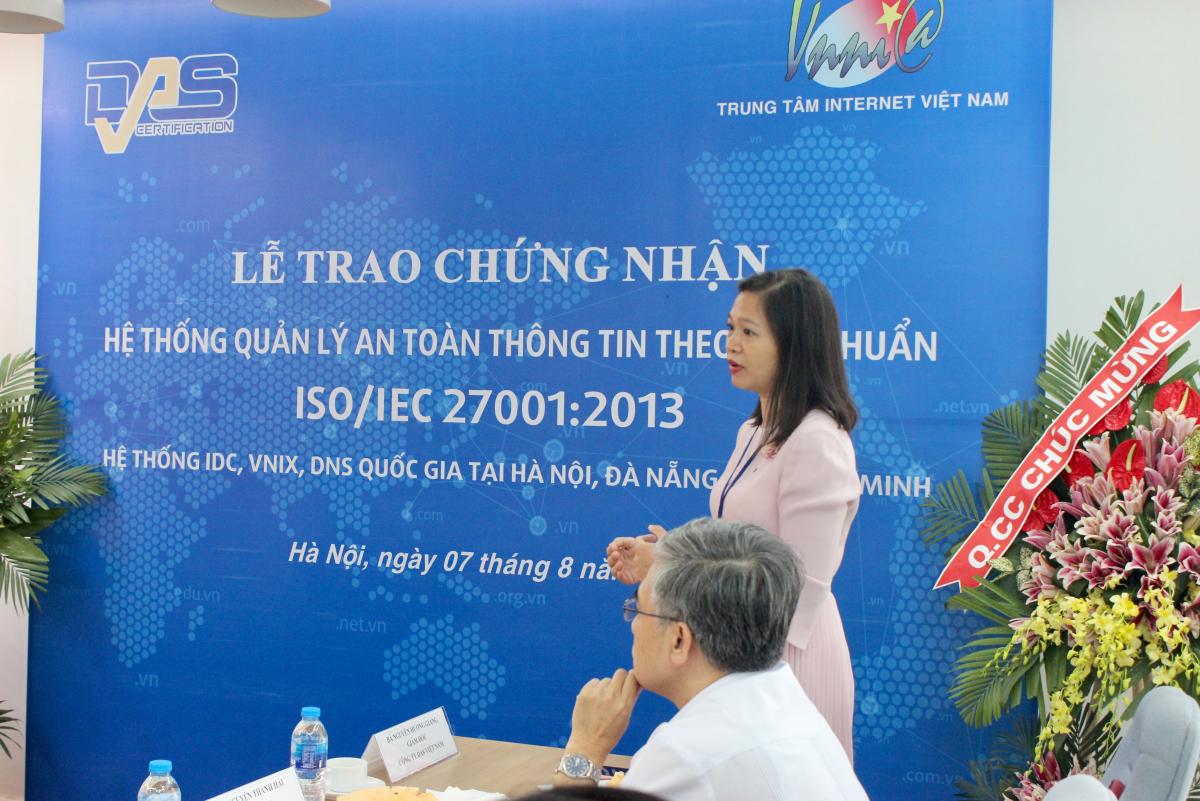 Ngày 7/8/2018 - Trung tâm Internet Việt Nam (VNNIC) tổ chức Lễ tiếp nhận chứng nhận “Hệ thống quản lý an toàn thông tin theo tiêu chuẩn ISO/IEC 27001:2013 trong hoạt động quản lý vận hành các hạ tầng trọng yếu của mạng Internet Việt Nam là hệ thống máy chủ tên miền DNS quốc gia .VN, hệ thống Trạm trung chuyển Internet quốc gia VNIX và hạ tầng trung tâm dữ liệu (IDC) tại Tp Hà Nội, Đà Nẵng, Hồ Chí Minh” do Tổ chức đánh giá và cấp chứng nhận DAS Vương quốc Anh cấp.