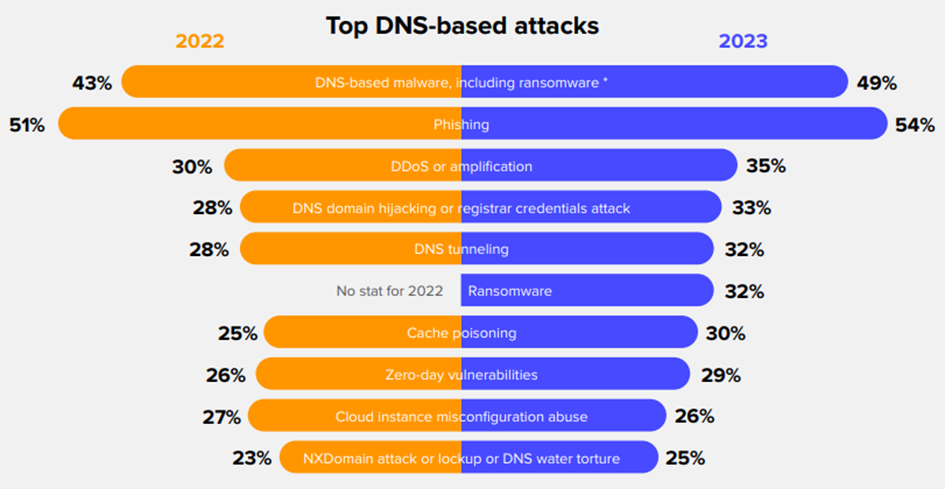 Cũng trong Báo cáo về các mối đe dọa DNS toàn cầu năm 2023 của Efficient IP, các dạng tấn công nguy hiểm dựa trên DNS (DNS-based) đều chiếm tỉ lệ rất cao so với các dạng tấn công sử dụng các nền tảng khác, như phát tán mã độc (malware, ransomware) chiếm đến 49%, lừa đảo (phishing) chiếm tỉ lệ cao nhất lên đến 54%, DNS tunneling (32%), DNS Cache poisoning (30%), NXDOMAIN (25%), …