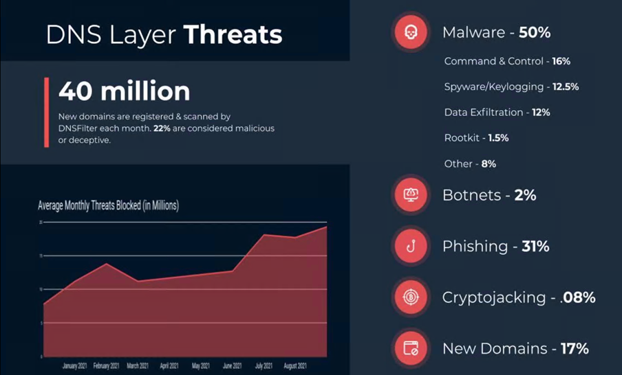 Theo số liệu phân tích của DNSFilter về các mối nguy an toàn an ninh của DNS trên hạ tầng hệ thống của DNSFilter bằng việc phân tích các tên miền đăng ký mới và rà quét hơn 40 triệu tên miền hàng tháng (từ 01/2021 đến tháng 8/2021) đã phát hiện ra có 22% tên miền liên quan đến hoạt động độc hại và lừa đảo.