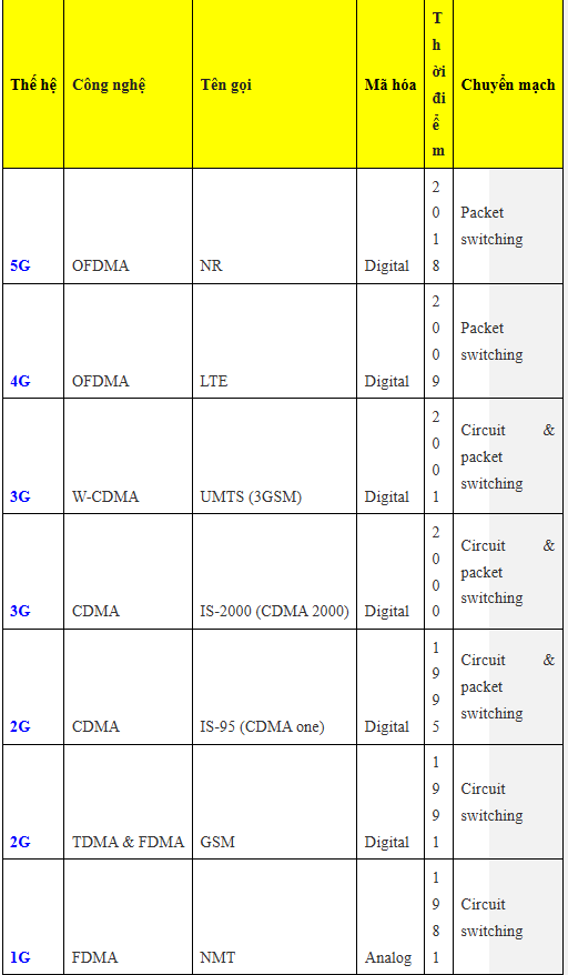 | Thế hệ | Công nghệ | Tên gọi | Mã hóa | Thời điểm | Chuyển mạch |