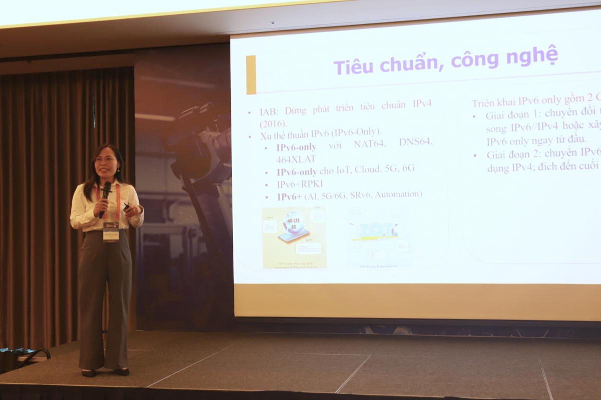 Bà Nguyễn Thị Oanh, Phó Trưởng phòng Hợp tác – Quản lý tài nguyên với phần trình bày về “Tổng quan về chuyển đổi IPv6, IPv6 only trên thế giới và tại Việt Nam”