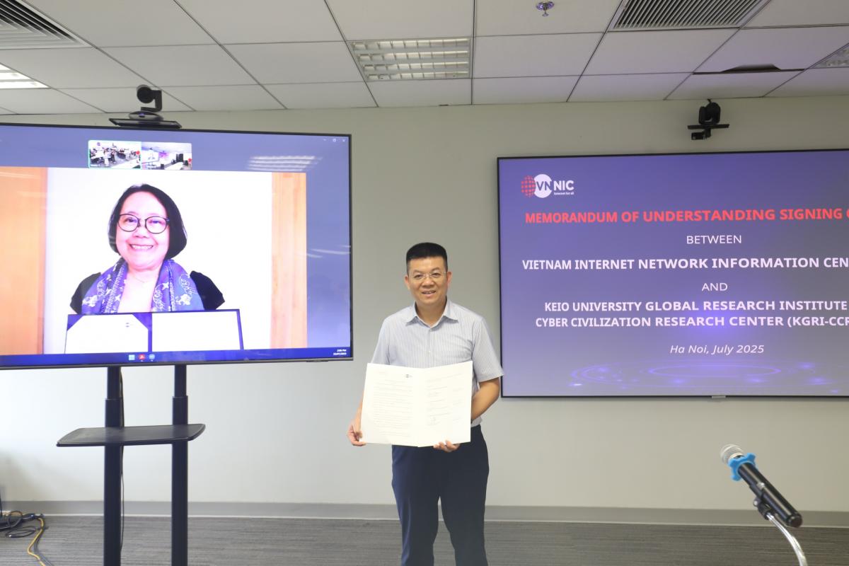 Cũng trong khuôn khổ buổi Workshop, VNNIC thực hiện lễ ký Biên bản ghi nhớ hợp tác (MoU) với Trung tâm CCRC - Viện Nghiên cứu quốc tế (KGRI) - Đại học Keio Nhật Bản, đánh dấu bước tiến mới trong quan hệ hợp tác giữa VNNIC và Trường đại học danh tiếng quốc tế, với mục tiêu thúc đẩy hơn nữa hoạt động phối hợp các đối tác quốc tế, kết nối tri thức, đưa sinh viên Việt Nam tham gia vào các hoạt động nghiên cứu, dự án quốc tế trong lĩnh vực Internet.
