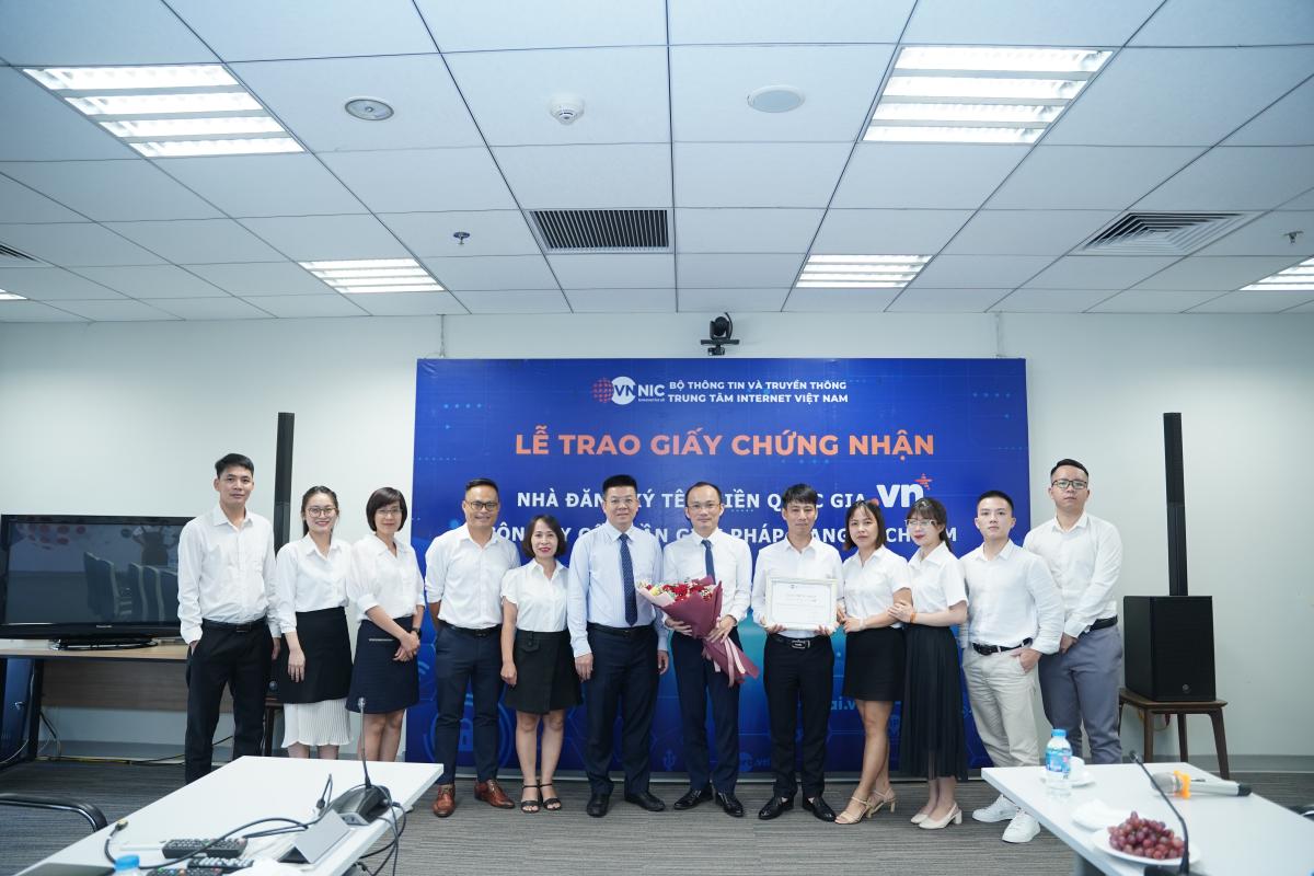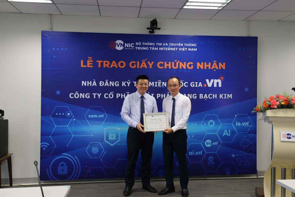 Ông Nguyễn Hồng Thắng – Giám đốc VNNIC trao Giấy chứng nhận Nhà đăng ký tên miền quốc gia “.vn” cho Công ty Cổ phần Giải pháp mạng Bạch Kim