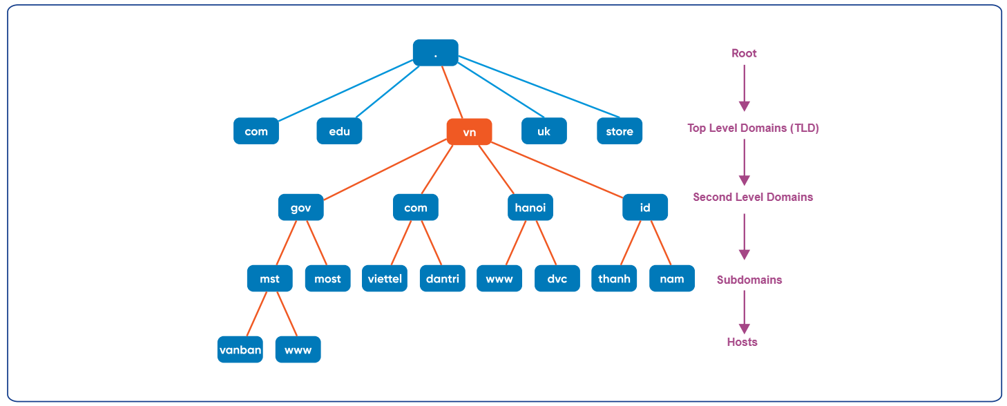 Top-Level Domain (TLD): The domain immediately below the root, for example: .vn, .us, .com, .net, etc.