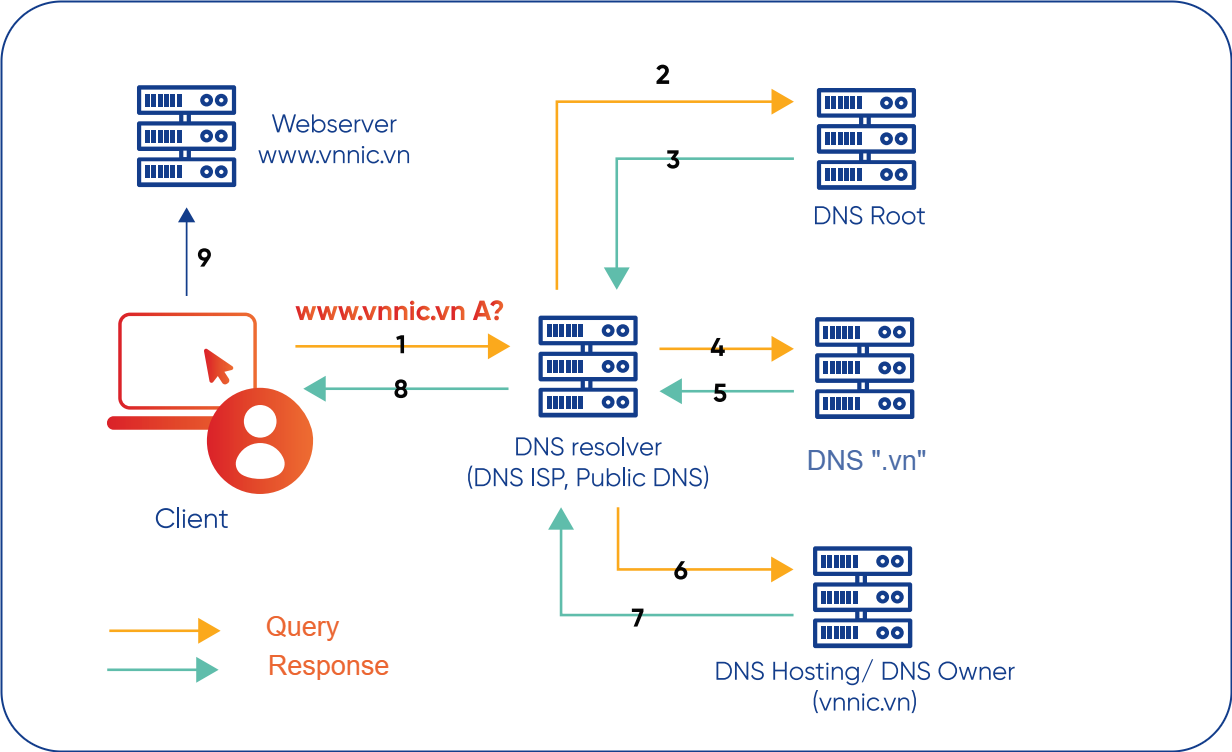 Step 6: The DNS resolver then queries the authoritative DNS servers for vnnic.vn to obtain the IP address of www.vnnic.vn