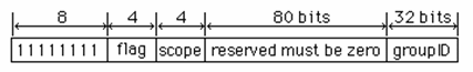 8 bít đầu tiên trong địa chỉ multicast luôn luôn là 1111 1111 (tức là FF theo dạng thức hexadecimal). “Flag” sử dụng từ bít thứ 9 đến bít 12 và chỉ ra xem liệu đây có phải là dạng địa chỉ multicast được định nghĩa trước (well-known). Nếu có là well-known, mọi bít sẽ là 0. “Scope” chiếm từ bít thứ 13 đến bít thứ 16. Nếu Scope ID = 2, ví dụ, thì đó là phạm vi link-local.