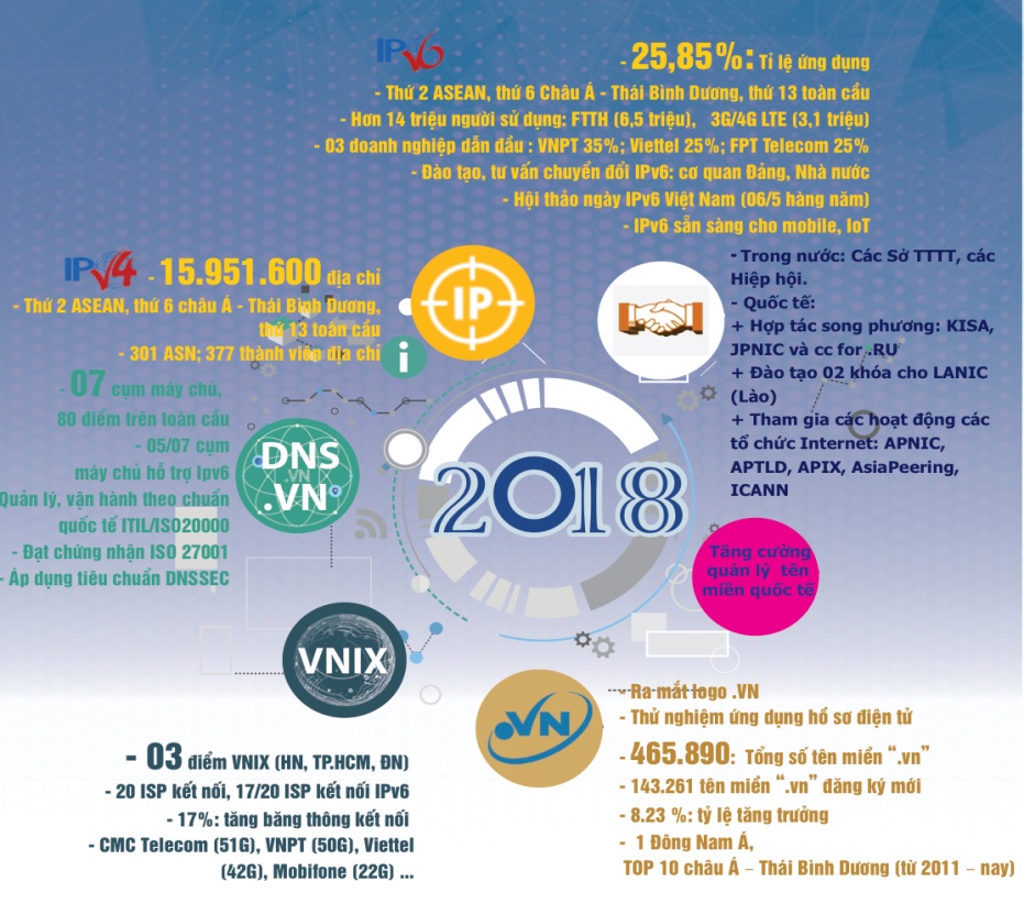 Năm 2018 đã ghi nhận những kết quả nổi bật trong việc thúc đẩy triển khai IPv6 tại Việt Nam với tỉ lệ sử dụng đạt 25,85%, đứng thứ 2 khu vực Đông Nam Á, thứ 6 khu vực Châu Á Thái Bình Dương, thứ 13 trên toàn thế giới. Tên miền “.vn” chính thức được đăng ký hoàn toàn trực tuyến qua hồ sơ điện tử, tạo thuận lợi tối đa cho người sử dụng. Tên miền không dấu “.vn” liên tục là tên miền quốc gia (ccTLD) có số lượng đăng ký sử dụng cao nhất khu vực Đông Nam Á, TOP 10 khu vực châu Á Thái Bình Dương kể từ năm 2011 đến nay. Bên cạnh đó, các hệ thống hạ tầng kỹ thuật trọng yếu quốc gia được đảm bảo hoạt động thông suốt, ổn định, an toàn và hiệu quả. Kết quả này đã cho thấy những nỗ lực của Trung tâm Internet Việt Nam (VNNIC) trong năm vừa qua.