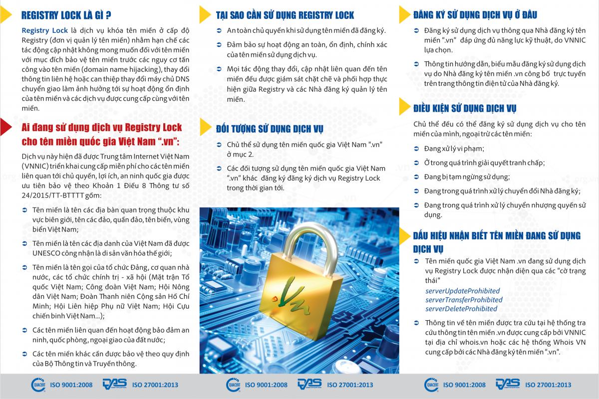 Registry Lock là dịch vụ khóa tên miền ở cấp độ Registry (đơn vị quản lý tên miền) nhằm hạn chế các tác động cập nhật không mong muốn đối với tên miền với mục đích bảo vệ tên miền trước các nguy cơ tấn công vào tên miền (domain name hijacking), thay đổi thông tin liên hệ hoặc can thiệp thay đổi máy chủ DNS chuyển giao làm ảnh hưởng tới sự hoạt động ổn định của tên miền và các dịch vụ được cung cấp cùng với tên miền. Mọi tác động thay đổi, cập nhật liên quan đến tên miền đang sử dụng dịch vụ đều được thực hiện dưới sự phối hợp và quản lý chặt chẽ giữa Registry và các Nhà đăng ký quản lý tên miền.