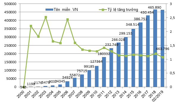 Biểu đồ tăng trưởng tên miền “.vn” đang duy trì sử dụng qua các năm (Số liệu tính đến tháng 2/2019)