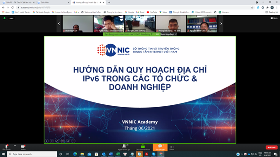 Thực hiện công tác tư vấn, hỗ trợ chuyển đổi IPv6 cho cơ quan nhà nước theo Chương trình IPv6 For Gov giai đoạn 2021-2025 (ban hành theo Quyết định số 38/QĐ-BTTTT ngày 14/01/2021 của Bộ trưởng Bộ Thông tin và Truyền thông), ngày 9/6/2021, Trung tâm Internet Việt Nam (VNNIC) tổ chức buổi hội thảo trực tuyến chuyên đề “Hướng dẫn quy hoạch địa chỉ IPv6” cho các Sở Thông tin và Truyền thông khu vực miền Trung và Tây nguyên. Chương trình được thực hiện theo hình thức trực tuyến trên nền tảng VNNIC Internet Academy (https://academy.vnnic.vn). Tham dự buổi đào tạo gồm 30 chuyên viên, kỹ sư là những nhân sự trực tiếp tham mưu xây dựng kế hoạch chuyển đổi IPv6 tại địa phương.