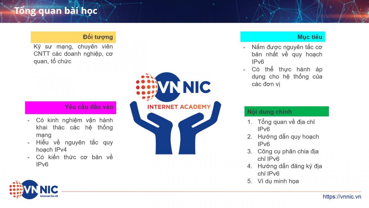 Ngày 5/8/2021 Trung tâm Internet Việt Nam (VNNIC), với vai trò là đơn vị quản lý hoạt động cấp phát tài nguyên địa chỉ Internet quốc gia tại Việt Nam đã triển khai buổi tập huấn trực tuyến (Webinar) với chủ đề “Hướng dẫn quy hoạch địa chỉ IPv6 cho các tổ chức và doanh nghiệp”.