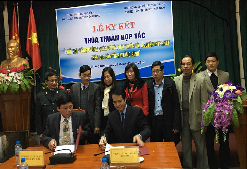 Ngày 25/02/2016, tại Hội trường Sở Thông tin và Truyền thông tỉnh Quảng Bình đã diễn ra Lễ ký kết “Thỏa thuận hợp tác về phối hợp tăng cường quản lý và phát triển tài nguyên Internet” giữa Trung tâm Internet Việt Nam (VNNIC) và Sở Thông tin và Truyền thông Quảng Bình (Sở TT&TT Quảng Bình).