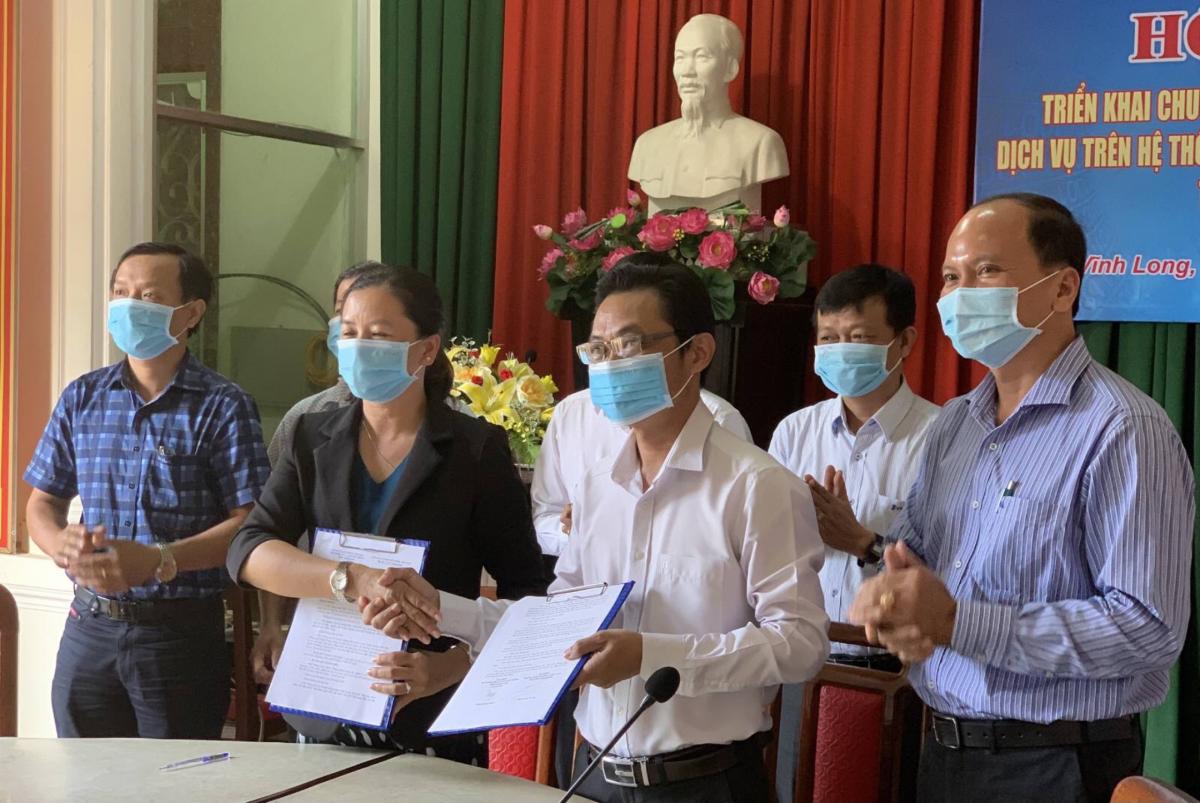Ông Đỗ Quang Trung, Trưởng chi nhánh VNNIC tại TP.HCM đại diện VNNIC và bà Đoàn Hồng Hạnh, Giám đốc Sở TTTT tỉnh Vĩnh Long đại diện Sở TTTT tỉnh Vĩnh Long thực hiện lễ ký thỏa thuận hợp tác tăng cường quản lý và phát triển tài nguyên Internet trên địa bàn tỉnh