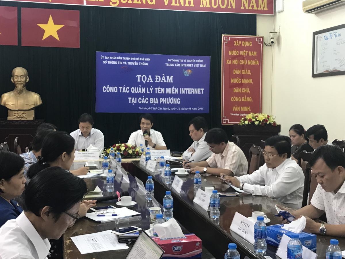 Nhằm tăng cường hiệu quả công tác quản lý nhà nước về tên miền Internet, ngày 16/08/2018, tại Trụ sở Sở Thông tin và Truyền thông TP. HCM (Sở TT&TT TP HCM), Trung tâm Internet Việt Nam (VNNIC) và Sở TT&TT TP HCM đã phối hợp tổ chức chương trình tọa đàm công tác quản lý tên miền Internet để trao đổi những vướng mắc, chia sẻ những khó khăn, kinh nghiệm trong công tác thanh kiểm tra việc đăng ký sử dụng tên miền. Tham dự tọa đàm có Lãnh đạo, đại diện các đơn vị của VNNIC và đại diện của các Sở TT&TT tại các địa bàn trọng điểm, thành phố lớn như: Bà Rịa-Vũng Tàu, Bến Tre, Bình Dương, Bình Phước, Cần Thơ, Đà Nẵng, Đồng Nai, Đồng Tháp, Hà Nội, Lâm Đồng, Long An, Ninh Bình, Tây Ninh, Thành phố Hồ Chí Minh.
