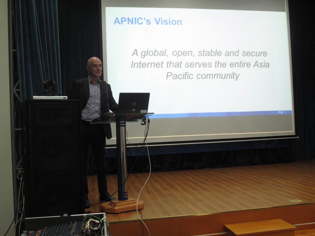 Ông Paul Wilson, Giám đốc Trung tâm Thông tin mạng Châu Á - Thái Bình Dương (APNIC), phát biểu tại hội nghị