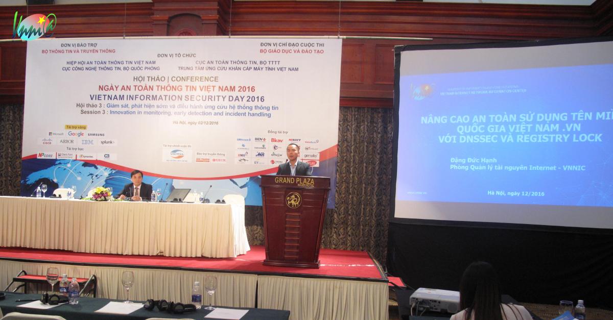 Tham dự chương trình sự kiện, đại diện VNNIC trình bày tham luận mang tên “Nâng cao an toàn sử dụng tên miền quốc gia Việt Nam với DNSSEC và dịch vụ Registry Lock” với các nội dung giới thiệu về các nguy cơ mất an toàn khi sử dụng tên miền trên môi trường mạng Internet, qua đó cung cấp thông tin về các giải pháp kỹ thuật, dịch vụ Trung tâm Internet Việt Nam (VNNIC) đang tập trung triển khai với vai trò cơ quan quản lý nhà nước về tài nguyên tên miền Internet nhằm đảm bảo sự hoạt động an toàn, ổn định cho tên miền quốc gia Việt Nam “.vn”