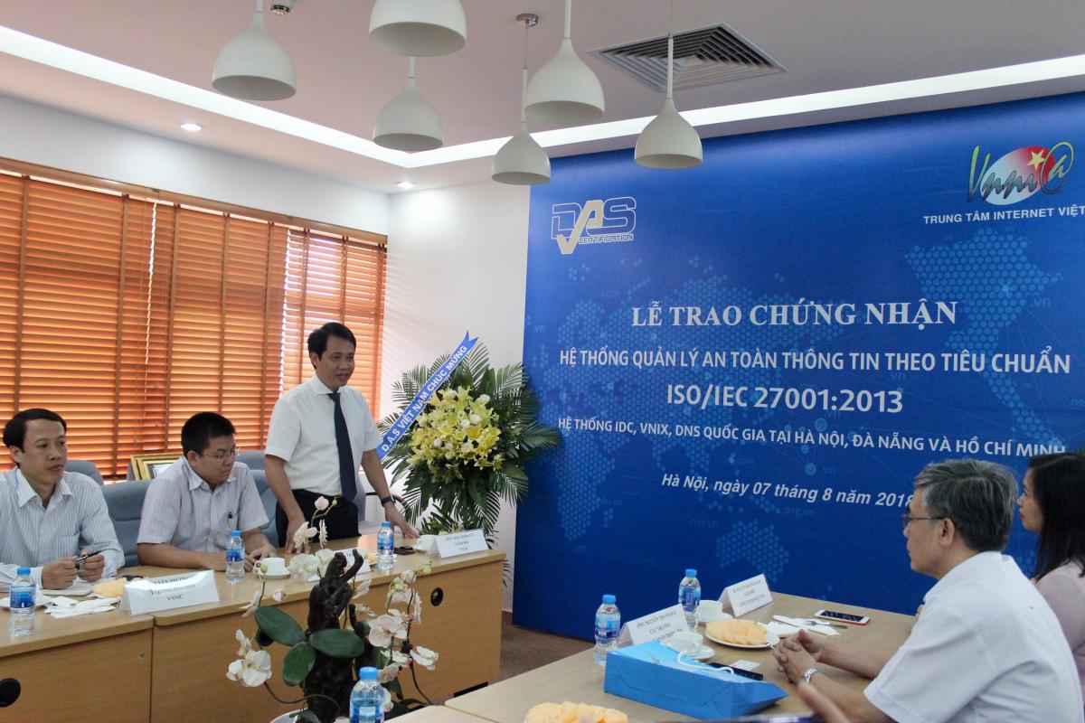 Ngày 7/8/2018 - Trung tâm Internet Việt Nam (VNNIC) tổ chức Lễ tiếp nhận chứng nhận “Hệ thống quản lý an toàn thông tin theo tiêu chuẩn ISO/IEC 27001:2013 trong hoạt động quản lý vận hành các hạ tầng trọng yếu của mạng Internet Việt Nam là hệ thống máy chủ tên miền DNS quốc gia .VN, hệ thống Trạm trung chuyển Internet quốc gia VNIX và hạ tầng trung tâm dữ liệu (IDC) tại Tp Hà Nội, Đà Nẵng, Hồ Chí Minh” do Tổ chức đánh giá và cấp chứng nhận DAS Vương quốc Anh cấp.