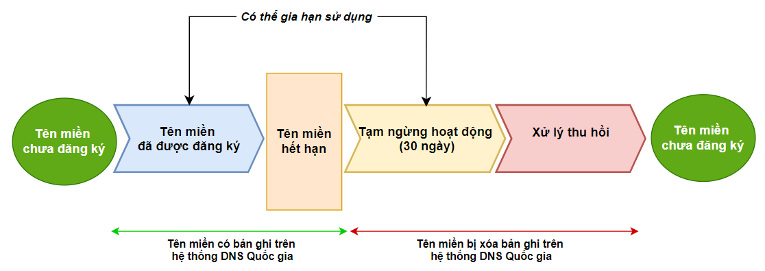 Trạng thái xử lý thu hồi: Sau 30 ngày kể từ ngày hết hạn, tên miền sẽ chuyển sang trạng thái xử lý thu hồi và chủ thể không thể gia hạn tên miền. Tên miền sẽ bị thu hồi ngẫu nhiên, tự động tại thời điểm bất kỳ trong khoảng thời gian này và đưa về trạng thái tự do để các cơ quan, tổ chức, cá nhân có nhu cầu đăng ký sử dụng theo quy định.