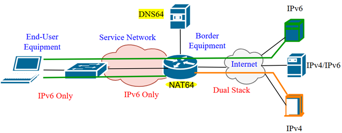 Trong đó, Border Equipment là nơi kết nối trực tiếp với Internet, do Internet vẫn tồn tại số lượng lớn dịch vụ IPv4 Only nên kết nối ra ngoài của thiết bị này bắt buộc phải duy trì Dual-Stack. Vì vậy có hai mô hình cho việc chuyển đổi sang IPv6 Only: