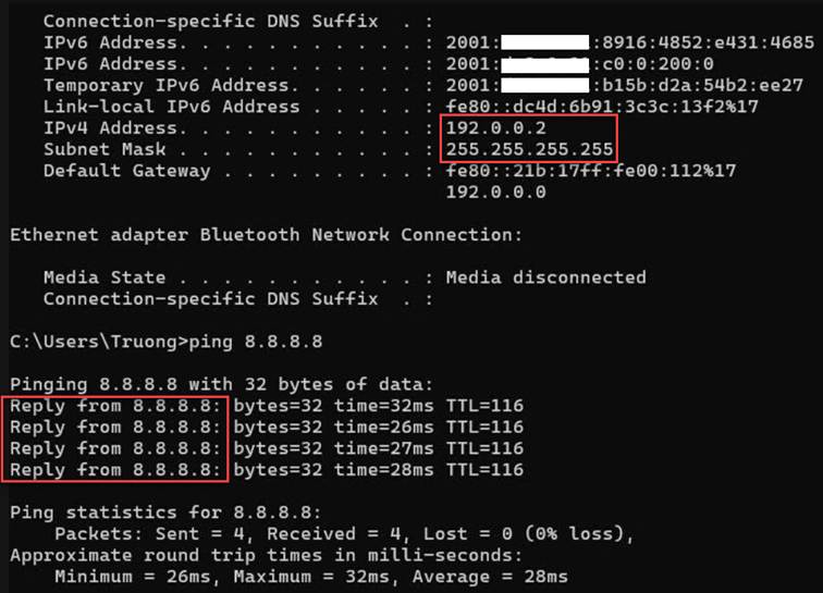 Hình 4: Kết quả thử nghiệm CLAT trên Windows Insider Preview của VNNIC