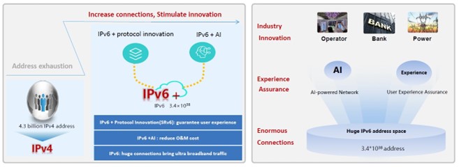 Theo phân tích của Viện tiêu chuẩn Viễn thông châu Âu (ETSI), công nghệ cải tiến IPv6 (IPv6+AI, IPv6+SRv6,…) sẽ trở thành xu hướng chính để nâng cấp và cải tiến mạng Internet; đồng thời tác động trực tiếp đến GDP của một quốc gia, tạo ra nền tảng số hoá cho nhiều ngành công nghiệp. Cụ thể, IPv6+AI giúp rút ngắn 80% thời gian phân tích nguyên nhân sự việc và giảm 50% chi phí vận hành, bảo dưỡng cho các ngành sản xuất. Trong lĩnh vực tài chính, công nghệ mới trên nền IPv6 nâng cao tính linh hoạt trong các giao dịch trực tuyến và thanh toán kỹ thuật số. SRv6 cho phép các chi nhánh và đại lý ở các khu vực khác nhau có thể truy cập các dịch vụ đám mây chỉ trong một bước.