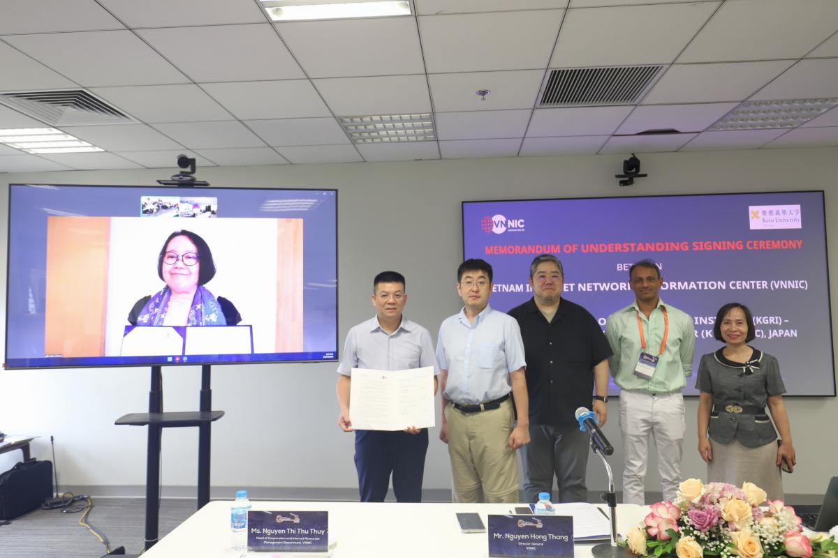 Cũng trong khuôn khổ buổi Workshop, VNNIC thực hiện lễ ký Biên bản ghi nhớ hợp tác (MoU) với Trung tâm CCRC - Viện Nghiên cứu quốc tế (KGRI) - Đại học Keio Nhật Bản, đánh dấu bước tiến mới trong quan hệ hợp tác giữa VNNIC và Trường đại học danh tiếng quốc tế, với mục tiêu thúc đẩy hơn nữa hoạt động phối hợp các đối tác quốc tế, kết nối tri thức, đưa sinh viên Việt Nam tham gia vào các hoạt động nghiên cứu, dự án quốc tế trong lĩnh vực Internet.