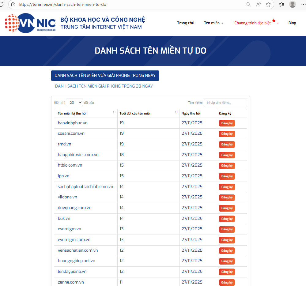 Danh sách tên miền “.vn”giải phóng về trạng thái tự do được công bố trên trang https://tenmien.vn/danh-sach-ten-mien-tu-do